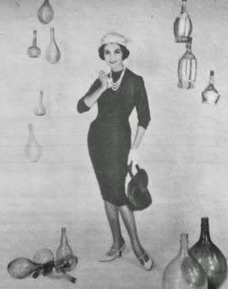 BİLHASSA GENÇ KIZLAR İÇİN : Kırmızı yünlü jarseden yapılmış bir elbise. Bel kesik ve sentürlüdür. İki taraflı büyük cepleri geniş pli arasına konmakla modele apayrı bir hususiyet verilmiştir. Göğüsten geçen pensler "Y" şeklinde dikilmiştir... Luisa Spagnoli vasıtasıyla takdim eden Suavi Sonar...1958 |