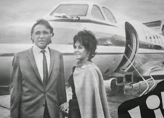 Liz ve Kocası yeni uçaklarının önünde poz veriyorlar... İki jet motorlu bu uçağı Richard Burton eşi Elizabeth Taylor'a doğum gününde 10 milyon liraya satın alıp hediye etmiştir. Ve uçağa "Güzel bebeğin" adı konmuştur. Ünlü çift "Dr. Faust" filminin galası için Londra'ya bu uçakla gelmişlerdir...1967 |