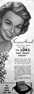 Françoise Arnoul Cazip Fransız yıldızı diyor ki : "Ben LÜKS tuvalet sabununu kullanırım." Mükemmel bir ten ! İşte bir sinema yıldızının en kıymetli varlığı ! Sinema yıldızlarından onda dokuzu da günlük tuvaletleri için saf ve latif olan LÜKS tuvalet sabununa güvenirler. Bol miktardaki kaymak gibi köpüğü hakiki bir güzellik müstahzarıdır ve LÜKS tuvalet sabununun enfes kokusunu çok beğeneceksiniz. LÜKS tuvalet sabununun köpüğü ile cildinizi biraz ovuşturunuz. Bundan sonra evvela sıcak su ile müteakiben soğuk ile yıkayıp yumuşak bir havlu ile hafifçe kurulayınız. Neticede bir sinema yıldızının ki gibi taze ve çok güzel bir tene sahip olacaksınız. LUX TOILET SOAP 2120 sinema yıldızının tercih ettiği...1960 |