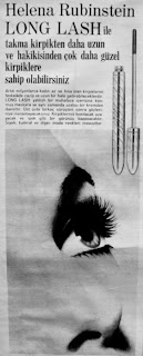 Helena Rubinstein LONG LASH ile takma kirpikten daha uzun ve hakikisinden çok daha güzel kirpiklere sahip olabilirsiniz... Artık milyonlarca kadın az ve kısa olan kirpiklerini fevkalade cazip ve uzun bir hale getirebileceklerdir. LONG LASH yaldızlı bir muhafaza içerisine konmuş maskara ve aynı zamanda uzatıcı bir kremden ibarettir. Üst üste birkaç sürüşten sonra gözlerinize inanamayacaksınız. Kirpikleriniz kıvrılacak, uzayacak ve ipek gibi bir görünüş kazanacaktır. Siyah, kumral ve diğer moda renkleri mevcuttur...1967 |