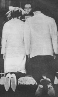 MUZİPLİK Mİ ? YOKSA GERÇEKÇİLİK Mİ ? Londra'da geçenlerde bir kilisede nikaha davetli olanlar gelinle damat tören icabı papazın karşısında resimde gördüğünüz gibi diz çöktükleri zaman gülmemek için kendilerini zor tuttular. Çünkü damadın ayakkabısının tabanlarının altına iki kelime yazılmıştı "Help Me - Kurtarın Beni !". Kilisede bulunan bütün davetlileri törenden sonra damadı bir açıklama yapmaya zorlatan olayın bir muziplik mi, yoksa damadın bir oyunu mu olduğu anlaşılamadı...1966 |