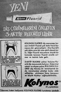 YENİ Kolynos Fluorid DİŞ ÇÜRÜMELERİNİ ÖNLEYEN 3 AKTİF FLUORİD'LİDİR... KOLYNOS FLUORİD diş macununa konan 3 aktif fluorid çok daha fazla koruyucu bir güce sahiptir; Zira fluorid'i çok daha uzun bir süre aktif olarak kalır. Diğer fluorid macunların büyük bir kısmında bulunan fluorid süratle erimez ve tesirsiz hale gelir. 3 aktif fluorid yalnız kolynos fluorid diş macununda bulunur. Dişlerinizi sabah ve akşam yalnız kolynos fluorid diş macunu ile temizleyerek bir diş macunundan şimdiye kadar elde edilebilen çürümeye karşı koruyucu en büyük faydayı sağlayabilirsiniz. Tükenmez kalem hediyemiz KOLYNOS FLUORID kutularının içindedir. * Bu dişte kolynos fluorid diş macunu kullanılmamıştır. Diş minesinin mukavemeti zayıf olup yabancı maddeler dişe rahatça tesir etmektedir. * Bu diş kolynos fluorid ile fırçalanmıştır. Diş minesi çok daha mukavim bir durumda olup ağız asitlerine karşı durmakta ve diş çürümesini önlemektedir...1966 |