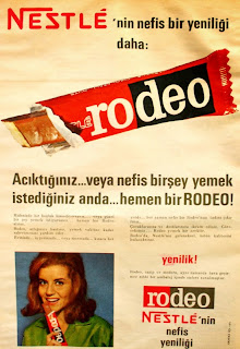Nestle'nin nefis bir yeniliği daha... NESTLE RODEO Acıktığınız... Veya nefis bir şey yemek istediğiniz anda... Hemen bir RODEO ! Midenizde bir boşluk hissediyorsanız... Veya güzel bir şey yemek istiyorsanız... Hemen bir Rodeo alınız. Rodeo açlığınızı bastırır, yemek vaktine kadar sabretmenize yardım eder. Evinizde... İş yerinizde... Veya sinemada... Kısaca her yerde... Her zaman nefis bir Rodeo'nun tadını çıkarınız... Çocuklarınıza ve dostlarınıza ikram ediniz. Göreceksiniz... Rodeo yemek bir zevktir. Rodeo'da Nestle'nin geleneksel, üstün kalitesini bulacaksınız. Yenilik ! Rodeo, cazip ve modern. Aynı zamanda hava geçirmez sıhhi bir ambalaj içinde sizlere sunulmuştur. Rodeo Nestlé'nin nefis yeniliği....1967 |