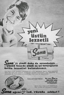 Yeni üstün lezzetli Sana Vitaminli Sana'yı şimdi daha da seveceksiniz... Çünkü Sana'da şimdi en iyi tereyağların üstün lezzetini bulacaksınız. Evet sana'yı şimdi ekmeğinize daha büyük bir zevkle süreceksiniz. Sana'yı daima geliştirmek, daima daha üstün hale getirmek için devamlı gayretler sarf edilmekte. Uzun araştırmalar yapılmaktadır. Bu araştırmaların neticesinde sana şimdi üstün bir lezzet kazandı. Bunu biliyor muydunuz ? Her sene Sana'ya 900.000 kilo taze pastorize süt katılmaktadır. Ayrıca ihtiva ettiği a ve d vitaminleri ile sana, çocuklar için mükemmel bir gıdadır... Sana ağza üstün bir tat. Vücuda sıhhat ! (1966) |