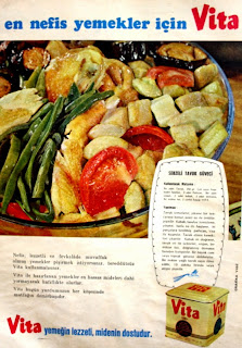 En nefis yemekler için Vita Nefis, lezzetli ve fevkalade muvaffak olmuş yemekler pişirmek istiyorsanız tereddütsüz Vita kullanmalısınız. Vita ile hazırlanan yemekler en hassas mideleri dahi yormayacak hafiflikte olurlar. Vita bugün yurdumuzun her köşesinde mutfağın demirbaşıdır. Sebzeli Tavuk Güveci Kullanılacak malzeme : Bir adet tavuk, 250 gr. çalı veya Ayşe kadın fasulye, 2 adet patlıcan, bir adet soğan, 2 adet kabak, 2 adet domates, bir miktar tuz, 2 çorba kaşığı vita. Yapılması : Tavuk temizlenir, yıkanır bir tencereye konur ve üzeri su ile örtülür, pişirilir. Kabak ve fasulye temizlenir, yıkanır, tuzlu su ile haşlanır, iri parçalara kesilmiş patlıcan vita ile kızartılır. Tavuk etinin kemikleri çıkarılır. Kabak iri doğranır, tavuk eti ile sebzeler, soğan, bir miktar tuz, domates beraber karıştırılır. Bir büyük cam veya toprak güvece doldurulur. Bir miktar yağlı tavuk suyu ilave edilir ve 15 dakika fırında veya ateşte pişirilir. Vita yemeğin lezzeti, midenin dostudur...1966 |