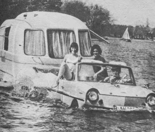 AH BİR DE UÇABİLSE... Şimdi artık Avrupa'da yüzen otomobillere yüzen römorklarda takılıyor. Böylece artık herkesin adet edindiği yaz gezmelerinde otel masrafı ve diğer masraf dertleri de ortadan kalkmış oluyor... Amfikar (amficar) tipi bir araba tarafından çekilen bu yüzer römorkun içinde banyo, tuvalet, mutfak gibi her türlü konforun yanı sıra ekstradan kalorifer ve buzdolabı da vardır... |