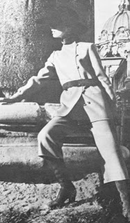 Goşo pantolon takımı. Uzun ceketi yandan düğmelenen modelin orijinal kemeri deriden yapılmıştır. Ceketin ilikleri biyedendir. Aynı kumaştan yapılmış bir mantonun içine giyilen bu takımın modeli İtalyan modacı Andre Laug koleksiyonundan alınmadır...1970 |