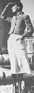 Beyaz yünlüden yapılan düz midi eteğin önde iki büyük cebi vardır. Kolları bluz kolunu andıran dik yakalı küçük ceket tüvit yünlüden yapılmıştır...1970