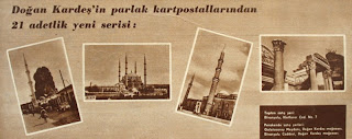 DOĞAN KARDEŞ KARTPOSTALLARI Türkiye'nin şimdiye kadar görülmemiş güzellikte kartpostalları Doğan kardeş ve Tifdruk matbaaları tarafından en son baskı usulleri ile basılmıştır. 44 çeşit 4 renkli 52 çeşit tek renkli İstanbul - Ankara - İzmir - Efes - Bergama - Bursa - Konya - İznik - Ürgüp manzaraları 4 renkli kartpostallar 50 kuruş Tek renkli kartpostallar 35 kuruş (1957) |