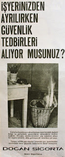 İŞ YERİNİZDEN AYRILIRKEN GÜVENLİK TEDBİRLERİ ALIYOR MUSUNUZ ? Çalışma hayatınızın aksamaması iş yerinizdeki değerli belge ve gereçlerin güvenliğine vereceğiniz öneme bağlıdır. Örneğin söndürülmeden çöp sepetine atılan bir sigara izmariti, akla gelmeyecek zararlara yol açar. Yangın, infilak gibi olayları önlemek için, iş yerinizden ayrılmadan önce güvenlik tedbirlerini ihmal etmeyiniz. DOĞAN SİGORTA Sizin Sigortanız (1970) |
