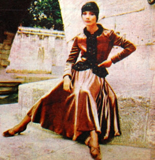 Vücudu saran kısa ceketi, siyah renkli fantezi harç ve boncukla işlenen tuvaletin uzun eteği kloş biçilmiştir. Model