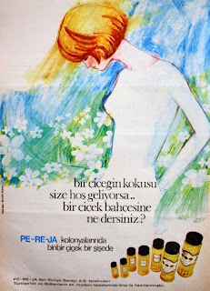 Bir çiçeğin kokusu size hoş geliyorsa... Bir çiçek bahçesine ne dersiniz ? PE-RE-JA kolonyalarında bin bir çiçek bir şişede... PEREJA İleri Kimya Sanayi A.Ş. tarafından Türkiye'nin ve Balkanların en modern tesislerinde itina ile hazırlanmıştır... (1970) |