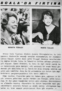 SCALA'DA FIRTINA RENATA TEBALDI - MARIA CALLAS Milano scala tiyatrosu müdürü Antonio Ghiringhella'nın, bu ünlü operanın Moskova'da vereceği temsiller münasebetiyle bir müddettir uykusu kaçıyor. Çünkü davet sahibi Nikita Kruşçev, Moskova temsillerinden hiç değilse birinde, Callas ile Tebaldi'nin birlikte sahneye çıkmalarını şart koşuyor. Opera direktörü bu konu ile ilgili olarak yaptığı basın toplantısında şöyle demiştir : "İki astronotu bir arada fezaya göndermek çok daha kolay bir iş. Teknik bir arıza olmadığı taktirde sağ salim yere inebilirler. Ama, bu iki primadonna için durum öyle değil. Birbirlerine zarar vermeyeceklerine kim temin edebilir ?" Diğer taraftan, Viyana'dan gelen bir habere göre çağımızın en büyük orkestra şeflerinden sayılan Herbert von Karajan, sahibi bulunduğu iki dişi çoban köpeğinden birinin adını "Callas" diğerini ise "Tebaldi" koymuş. Hayvanların bu durum karşısında nasıl geçinebildiklerini soranlara Karajan şu cevabı vermiş : "Hırlaşmaya başladılar mı, birer sopayla yatıştırıyorum. Kuzu gibi oluyorlar...1962" |