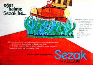 Eğer halınız Sezak ise... Bilin ki bu halının her bir havı dev bir direnişle üstten gelen tazyike karşı koyar ezilmemek için... Ölmemek için... Ve Sezak halısı dipdiri bir görünüşle her zaman tok, her zaman pırıl pırıl, her zaman yepyenidir... SANKİ BUGÜN DÖŞENMİŞ GİBİ... Yalnız sezak halılarında hav yüksekliği 15 mm. dir. Sezak HALILARI Genel satıcısı : OSMAN SEZİK OĞULLARI KOLL. ŞTİ. (1970) |