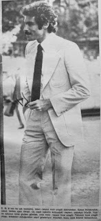 C. G. V.'nin bu şık kostümü mavi-beyaz ince çizgili dakron kumaştan. Kalça hizasındaki ceket üstten spor dikişli. Üç cepli ceketin kalçadaki cepleri oldukça büyük. Yazlık takımın içine giyilen gömlek yine mavi-beyaz ince çizgili. Takımın ince çizgili oluşu erkekleri olduğundan zayıf gösteriyor. Kıyafeti koyu renk kravat tamamlıyor...1975 |