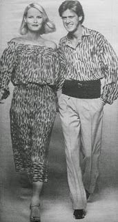 Christian Dior'un hem erkek, hem de kadınlar için kullandığı krepdöşin sarı, kırmızı ve mor rengi desenli. Elbisenin omuzları açıkta bırakan büzgülü yakasının önüne kumaşın çizgileri enine olarak roba geçirilmiştir. Bol ve dökük elbisenin belini ince bir kemer süslemekte. Etek ucu yine kumaşın enine geniş bir parçasıyla çevrili. Erkekler için hazırlanmış olan gömlek dökük hatlarıyla özellik kazanmış görülmekte. Omuzları düşük. Bej ipekli pantolonun beline siyah kuşak sarılmıştır...1977 |