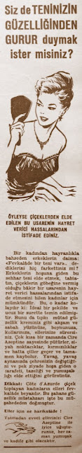 Siz de TENİNİZİN GÜZELLİĞİNDEN GURUR duymak ister misiniz ? ÖYLEYSE ÇİÇEKLERDEN ELDE EDİLEN BU USARENİN HAYRET VERİCİ HASSALARINDAN İSTİFADE EDİNİZ. Bir kadından hayranlıkla bahseden erkeklerin daima : "Fevkalade bir teni var." dediklerini hiç fark ettiniz mi ? Erkeklerin hoşuna giden bu sehhar teni elde etmek, tabiatın, çiçeklerin göbeğine vermiş olduğu bakir bir usarenin hayret verici hassalarından istifade etmesini bilen kadınlar için mümkündür. Bu, o kadar kolaydır ki : İdeal bir şekilde ve ucuz bir surette temin edilmiştir. Bunu da tıpkı mutad güzellik kreminiz gibi akşam ve sabah yüzünüze, boynunuza, kollarınıza, ellerinize sürersiniz. Çok kısa bir zamanda Cire Aseptine sayesinde pütürler, siyah noktacıklar, kırmızılıklar ve hatta çiller geçer ve tamamen kaybolur. Yavaş yavaş aynanızda çehrenizin değiştiğini ve pek ziyade hoşa giden o zarafeti, tazeliği ve yumuşaklığı elde ettiğini görürsünüz. Dikkat : Cote d'azur'da çiçek toplayan kadınların elleri fevkalade beyazdır. Bu şahane güzellik müstahzarı işte bu müşahededen doğmuştur. Eller için ne harikulade ! Yatmadan evvel ellerinizi Cire Aseptine ile iyice uğuşturunuz, her zaman yumuşak ve kadife gibi olacaktır...1960 |