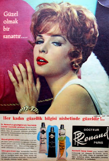 Güzel olmak bir sanattır... Her kadın güzellik bilgisi nisbetinde güzeldir !... Dr. Renaud'un güzelliğiniz için hazırladığı kremler mucize yaratıyor. Şayet bu güne kadar kullanmamışsanız muhakkak ki bir tecrübe ediniz. Kısa bir zamanda cildinizin güzelliğini hayranlıkla fark edeceksiniz. İşte size gece ve gündüz için iki ayrı krem : Meyveli gündüz kremi makyajdan evvel tatbik edilir, hafif sulandırıcı ve yağsızdır. Cilt tarafından çabuk emilir ve üst deriye dikkate şayan bir yumuşaklık verir... Makyajınızın daha iyi tatbik edilmesini ve tutunmasını temin eder. Silico gece kremi diğer kremlerden farklıdır; cildinizi korur ve besler, buruşmasını önler, rengini ve tazeliğini temin eder. Silico kremi cilt tahrişleri içinde şayanı tavsiyedir. Geceleri hafif bir masajla cildinize tatbik ediniz. DOCTEUR Renaud PARIS Karotenli havuç kremi genç kızların dahi kullanacağı bol vitaminli bir kremdir. Havuç özünden imal edilir. Cildin 18 yaşındaki tazeliğini muhafaza ettirir. Makyajdan yorulmuş cildi dinlendirir ve canlandırır...1963 |