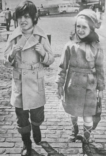 YAĞMURLU GÜNLERE ÇOCUKLAR İÇİN HAZIRLIK Yazın sıcak günleri geride kaldı. İlkokul çocukları için tatil sona erdi. Serin sonbahar yağmurları başlamadan onların sokak kıyafetlerini hazırlamak gerek, Paris'li modacılar ilkokul çağındaki kız ve erkek çocuklara şık ve kullanışlı su geçirmez yağmurluklar hazırladılar. Soldaki erkek çocuğunun pardösüsü su geçirmez Farnez Renoma - Coton'dandır. Üstten kapaklı büyük cepleri vardır. Sağda görülen kız çocuğunun yağmurluğu ise Daniel Hechter moda evine aittir...1972 |