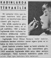 KADINLARDA TİRYAKİLİK Bir zamanlar tütün içen Avrupalı kadınlara kötü gözle bakılır ve kendilerinden adeta cüzamlı gibi kaçılırdı. Sıkı ahlak yasalarına göre, tütün kullanan kadın en alçak mahluk idi. 1881'e kadar İngiltere'de tütün kullanan kadınların ahlaksızlığı mahkemeler tarafından teyit edilmişti. İngiltere'de ikinci dünya savaşına kadar kadınlar, erkeklerle beraber oldukları zaman sigara içmez ve sokakta tütün kullanmazlardı. Şimdi kadınlar erkekler kadar ve hatta onlardan daha çok sigara içmektedirler. Son istatistiklere göre 1963 senesinde İngiltere'de tütün satışı rekor seviyeye yükselmiştir. Tütün kullanan kadınların yüzde ellisi evlidir. Pipo içen kadınlara bile rastlanıyor...1964 Hayat Dergisi. |