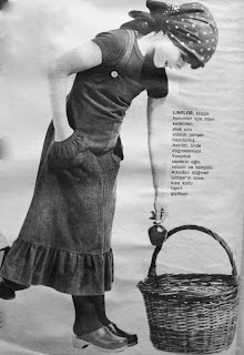 Askıdan önde düğmeleniyor. Yuvarlak ceplerin ağzı volanlı ve büzgülü. Arkadan düğmeli jumper'ın içine kısa kollu tişört giyiliyor...1975