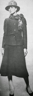 Nina Ricci moda evinin butik kısmında teşhir edilen kestane rengi düz yünlüden zarif bir tayyör modeli. Eteğin kesimi kloştur. Hafifçe vücuda oturan ceketi önde bir kemer ve küçük cepler süslemektedir. Emprime bir şapka ve eşarp takımın tamamlayıcı unsurlarından diğerleridir...1970 |