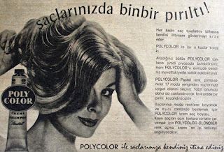 Saçlarınızda bin bir pırıltı ! Her kadın saç tuvaletine bilhassa kendisi ihtimam göstermeyi arzu eder. POLYCOLOR ile bu o kadar kolay ki... Aradığınız bütün POLYCOLOR tonlarını şimdi piyasada bulabilirsiniz. Hem POLYCOLOR'u evinizde kendiniz muvaffakiyetle tatbik edebilirsiniz. POLYCOLOR-pastel renk şampuanının 17 moda renginden saçlarınıza uygun olanını seçiniz. Tabii tonunuzu daha da canlandıracak fevkalade bir pırıltı kazandıracaktır. Saçlarınızı moda renklere boyamak ve aynı zamanda beslemek için POLYCOLOR krem saç boyası, Koyu saçları açık tonlara süratle çevirmek için POLYCOLOR-BLONDIER renk açma kremi en iyi neticeyi sağlayacaktır. POLYCOLOR ile saçlarınıza kendiniz itina ediniz...1963 |