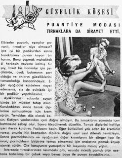 "GÜZELLİK KÖŞESİ" PUANTİYE MODASI TIRNAKLARA DA SİRAYET ETTİ... Elbiseler puanlı, eşarplar puanlı, tırnaklar niye olmasın ? İşte iyi bir pedikürden sonra tırnaklarına puan koyan bir hanım. Bunu yapmak muhakkak ki herkesin zevkine kalmış bir şey, fakat biz hanımlar için pedikürün, ayak bakımının şart olduğu ve onların güzelliklerini tamamladığı kanaatindeyiz. Eğer aşağıdaki kaidelere riayet ederseniz siz de evinizde iyi bir pedikür yapabilirsiniz. Ayaklarınızı sabunlu suyun içinde bir müddet tutup ovun. Kuruladıktan sonra tırnak diplerine yumuşatması için krem sürün. Tırnakları düz olarak kesin. Katiyen yanlarından içeri doğru almayın. Bu tırnakların zamanla içeri batmasına sebep olur. Sonra törpüleyerek düzeltin. Tırnak diplerini hafifçe içeri içerek kaldırın. Fazlasını kesin. Eğer kütikülleri yok eden bir kreminiz varsa onunla hiç kesmeden diplere doğru usul usul itilerek temizleyin. Sonra parmaklarınızı ve ayağınızın diğer kısımlarını bir sünger taşı ile ovun, parmakların birbirine temas etmemesi için aralarına pamuk koyup ojenizi sürün. Oje kuruyunca yumuşatıcı bir losyonla masaj yapın. İsterseniz tırnaklarınıza resimdeki gibi, ucunda incecik pamuk olan asetona batırılmış bir çubuk veya beyaz boya ile puan koyabilirsiniz...1962 |