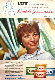 Lux tuvalet sabununun okşayıcı köpüğü ile cildinize Kadife Yumuşaklığı veriniz... Cildinin taze, yumuşak... Ve pürüzsüz kalması için Shirley Maclaine Lux tuvalet sabununa itimat eder. Siz de günlük tuvaletinizde LUX sabununu kullanınız. Bol ve tesirli köpüğü teninize layık olduğu taraveti temin edecektir. Yıldızların onda dokuzunun sabunu LUX (1963) |