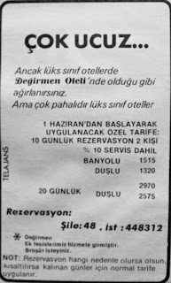 ÇOK UCUZ... Ancak lüks otellerde Değirmen otelinde olduğu gibi ağırlanırsınız. Ama çok pahalıdır lüks oteller. 1 HAZİRAN'DAN BAŞLAYARAK UYGULANACAK ÖZEL TARİFE : 10 GÜNLÜK REZERVASYON 2 KİŞİ % 10 SERVİS DAHİL BANYOLU : 1515 - DUŞLU : 1320 20 GÜNLÜK BANYOLU : 2970 - DUŞLU : 2575 Rezervazyon : Şile : 48 - İstanbul : 448312 * Değirmen ek tesislerimiz hizmete girmiştir. Broşür isteyiniz. NOT : Rezervasyon hangi nedenle olursa olsun, kısaltılırsa kalınan günler için normal tarife uygulanır...1975 |