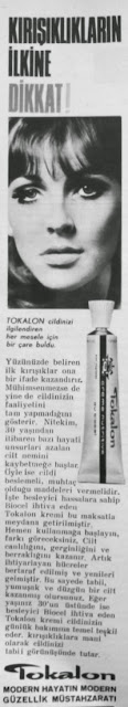 KIRIŞIKLIKLARIN İLKİNE DİKKAT ! Tokalon cildinizi ilgilendiren her mesele için bir çare buldu. Yüzünüzde beliren ilk kırışıklar ona bir ifade kazandırır. Mühimsenmezse de yinede cildinizin faaliyetini tam yapmadığını gösterir. Nitekim 30 yaşından itibaren bazı hayati unsurları azalan cilt nemini kaybetmeye başlar. Öyle ise cildi beslemeli, muhtaç olduğu maddeleri vermelidir. İşte besleyici hassalara sahip biocel ihtiva eden Tokalon kremi bu maksatla meydana getirilmiştir. Hemen kullanmaya başlayın, farkı göreceksiniz. Cilt canlılığını, gerginliğini ve berraklığını kazanır. Artık ihtiyarlayan hücreler bertaraf edilmiş ve yenileri gelmiştir. Bu sayede tabii, yumuşak ve düzgün bir cilt kazanmış olursunuz. Eğer yaşınız 30'un üstünde ise besleyici biocel ihtiva eden Tokalon kremi cildinizin günlük bakımına temel teşkil eder, kırışıklıklara mani olarak cildinizi tabii görünüşünde tutar. Tokalon MODERN HAYATIN MODERN GÜZELLİK MÜSTAHZARATI (1968) |