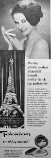 Paris'te günün modası vitaminli, kremli Pretty Quick taş pudrasıdır... Tokalon pretty quick'in Paris'teki süksesinin mahiyetinin izahı şudur : Tokalon Pretty Quick kadınların makyajları için tam manası ile her zaman aradıkları bir pudradır. Bununla yeni bir zihniyet mahsulü olarak bir kaç saniyede elde edilen ve saatlerce bozulmayan bir makyaj elde edilmiş olmaktadır. Tokalon pretty quick derinizi kuru yapmaz zira meşhur Tokalon kremlerinde olduğu gibi (hydratant) maddelerle vücuda getirilmiştir. Tokalon Pretty Quick çantanız için çok pratik şekilde hazırlanmış hususi birde ponpon ihtiva eden plastik bir kutuda takdim edilmektedir...1964 |