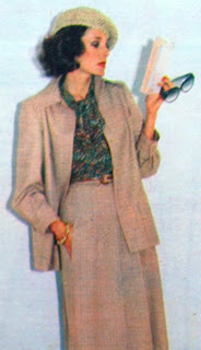 Christian Dior, rahat ve geniş tayyör ceketleriyle ağır basmakta. Bej üzerine yeşil ve pas rengi kareli yün takımın ceketi omuzdan itibaren boldur. Geniş kollar bileklerde manşetle toplanmakta. Etek geniş plili. Cepler iki yanda yırtmaç şeklinde açılmıştır...1975 |