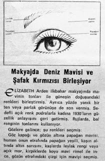 MAKYAJDA DENİZ MAVİSİ VE ŞAFAK KIRMIZISI BİRLEŞİYOR... Elizabeth Arden ilkbahar makyajında mavinin tonları ile güneşin doğuşundaki renkleri birleştirmiş. Ayrıca yüzde yanık bir ten veya parlak görünüşe de son vermiş. Sedefli açık renk pudralarla kadına 1930'ların güzellik anlayışını geri getirmiş. Rujlarda bal renginin tonlarını kullanıyor. Gözlere gelince; şu renkleri seçmiş : Göz kapağı ve gözün altına papağan mavisi, hemen onun etrafında papağan yeşili, kaşın altında altın sarısını, kaşlarda leylak rengi veya açık mor, kirpiklerde koyu mavi rimel ile ince, gözün etrafındaki çizgi için maviyi seçmiş...(1971 Hayat dergisi Kadın güzellik köşesi) |