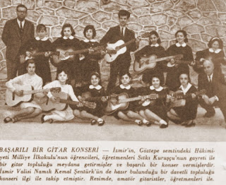 BAŞARILI BİR GİTAR KONSERİ İzmir'in Göztepe semtindeki Hakimiyeti milliye ilkokulunun öğrencileri, öğretmenleri Sıtkı Kuruşçu'nun gayretiyle bir gitar topluluğu meydana getirmişler ve başarılı bir konser vermişlerdir. İzmir valisi Namık Kemal Şentürk'ün de hazır bulunduğu bir davetli topluluğu konseri ilgi ile takip etmiştir. Resimde, amatör gitaristler öğretmenleri ile...1964 |