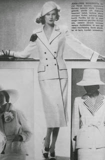 Jean Louis Scherrer'in beyaz flanel tayyörü çepeçevre lacivert kenarla süslü. Kruvaze gelerek yanda çift düğmeyle kapanan ceket bedene sıkıca oturuyor. Kollar yukarıya doğru kıvrık. Portföy tipi dar ve uzun eteğin kenarına geçirilen lacivert süs, ceketin devamı havasını veriyor. Ayakkabılar iki renk deriden hazırlanmış. Siyah bilezikler ve bere kıyafeti tamamlıyor...1975 |