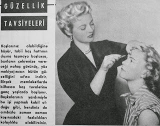 GÜZELLİK TAVSİYELERİ Kaşlarınız alabildiğine büyür, tabii kaş hattının dışına taşmaya başlarsa bunların çehrenize vereceği nahoş görünüş yüz makyajınızın bütün güzelliğini sıfıra indirir. Birçok memleketlerde bilhassa kaş tuvaletine genç yaşlarda başlanır. Başkalarının yardımıyla bu işi yapmak kabil olduğu gibi, kendiniz de cımbızla zaman zaman kaşınızdaki fazlalıkları kolaylıkla alabilirsiniz...1960 |