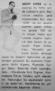 Müfit Kiper ve orkestrası bu hafta içinde Lübnan'a gitti. Beyrut'un meşhur gece kulüplerinden biri olan "EVE" ile bir senelik kontrat yapan orkestra gecede 100 dolar alacak. Halen aynı lokalde meşhur topluluk Bob Azzam da çalışıyor. Kiper orkestrası "Mustafa" şarkısını bütün dünyaya yayan bu başarılı toplulukla 10 gün beraber çalışacak. Bu seyahatte trompetist Müfit Kiper'e; piyanoda Turgut Dalar, bateride Vasfi Uçaroğlu, saks - vibrafonda Erol Erginer, kontrobasta Fikret Tarabuj eşlik edecekler. Topluluğun bu seyahatteki solisti ise Ayferi'dir. Kendilerine bu yolculuklarında başarılar dileriz. (8 Aralık 1962 Ses dergisi) |