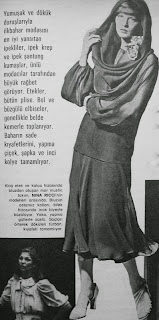 Yumuşak ve dökük duruşlarıyla ilkbahar modasını en iyi yansıtan ipekliler, ipek krep ve ipek şantung kumaşlar ünlü modacılar tarafından büyük rağbet görüyor. Etekler bütün plise. Bol ve büzgülü elbiseler genellikle belde kemerle toplanıyor. Baharın sade kıyafetlerini yapma çiçek, şapka ve inci kolye tamamlıyor. Kloş etek ve kalça hizasında bluzdan oluşan mor muslin takım Nina Ricci'nin modelleri arasında. Bluzun astarsız kolları bilek hizasında ince biye ile büzülüyor. Yaka yapma güllerle süslü. Saçları örterek dökülen türban kıyafeti tamamlıyor...1975 |