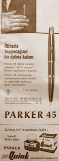 İftiharla taşıyacağınız bir dolma kalem. Parker 45 dolma kalemini süsleyen "ok"lu çengel * Parker markasının timsalidir. Parker 45 kalemlerinde markasına has kalite, zarafet ve sağlamlığı muhakkak takdir edeceksiniz... * Tescil edilmiştir. Parker 45 -Okul- çelik uçlu, 2 kartuşla 36.- TL Parker 45 -Arrow- altın uçlu, 2 kartuşla 60.- TL Her iki modele de uyar pompa 15.- TL 5 adet Parker Super Quink kartuşu 3.- TL PARKER 45 DAHA İYİ YAZMAK İÇİN : Solv-X ihtiva eden PARKER SUPER Quink mürekkebini kullanınız...1967 |