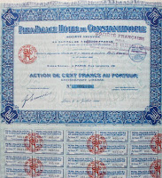 PERA PALACE HOTEL DE CONSTANTINOPLE SOCIETE ANONYME AU CAPITAL DE 7.500.000 FRANCS ACTION DE CENT FRANCS AU PORTEUR ENTIEREMENT LIBEREE Paris, le 10 Juillet 1922 (İstanbul Pera Palas Hotel De Constantinople Un Societé Française Grands Hotels International'a ait 10 Temmuz 1922 tarihli hisse senedi...) |