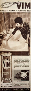 ÜÇ TESİRLİ EXTRA VIM TEMİZLER - PARLATIR - DEZENFEKTE EDER. Oksijenli köpüğü fevkalade kudretli olan Extra VIM, banyo ve lavabolarınızı saniyede temizler, kir ve lekeleri aniden yok eder. Extra VIM kullanıldığı yeri dezenfekte etmekle aynı zamanda mükemmel bir sıhhat kaynağıdır. BİR TECRÜBE YETER Kirli bir tavanın yarısını Extra VIM ile, diğer yarısını herhangi bir temizleyici toz ile temizleyiniz.Aradaki fark derhal gözünüze çarpacaktır. EXTRA VIM MİS GİBİ KOKAR EN KUDRETLİ TEMİZLEME TOZU (1962) |