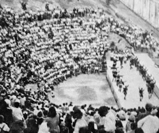 23. BERGAMA KERMESİ Her yıl tekrarlanan Bergama kermesi bu yılda büyük bir kalabalığın iştirakiyle kutlanmıştır. Asklepion tiyatrosunda halk oyunları oynanmış, Ankara konservatuvarı tiyatro bölümü ve Karşıyaka lisesi öğrencileri piyesler temsil etmişlerdir. Yandaki fotoğrafta Efelerin oyunu görülüyor...1959 (Foto : Mesut Erol - Bergama) |