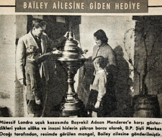 BAILEY AİLESİNE GİDEN HEDİYE Müessif Londra uçak kazasında Başvekil Adnan Menderes'e karşı gösterdikleri yakın alaka ve insani hislerin şükran borcu olarak Demokrat Parti Şişli Merkez Ocağı tarafından resimde görülen mangal Bailey ailesine gönderilmiştir. Resimde aile fertleri gönderilen mangalı incelerken görülmektedir..1959 |