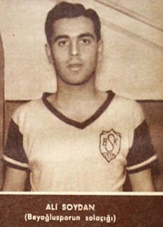 ALİ SOYDAN (Beyoğluspor'un sol açığı) 1934'de İstanbul'da doğdu. Şişli terakki lisesini bitirdi. 1951'de Galatasaray genç takımında futbola başladı. 6 yıl Galatasaray'da oynadıktan sonra Beyoğluspor'a girdi. Yapı ve kredi bankasının seçmiş olduğu centilmen sporcular arasında yer almış olmaktan çok memnun. "Bir futbolcu önce efendiliği ile göz doldurmalıdır." dedikten sonra bir saha hatırasını bize şu şekilde nakletmekte : "Bugün renklerini taşıdığım Beyoğluspor'a 4 yıl önce Galatasaray sol açığı olarak bir gol atmış, 0-0 bitecek bir maçın ibresini 1-0 Galatasaray'a kaydırmış idim. Birde Aliler maçını unutamam. 1953 yılında Fenerbahçe'yi 3-1 yenmiş, golün ikisini Büyük Ali, birini de ben, yani "Küçük Ali" atmıştım..." |