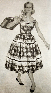 Claire Comte'nin hazırlamış olduğu şık bir yazlık elbise. Beden korsalı ve iki geniş britelli düşünülmüştür. Kumaşın beyaz kısmındaki bir buçuk santimlik siyah kurdele sonradan ilave edilmiştir. Kesik bel ve plili etekli bu modelin kadife kurdelesinde ve britellerindeki fiyonklar dikkat çekici bir hususiyettir...1959 |