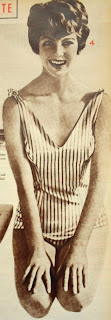 BU YAZ MAYOLAR ÇOK DEKOLTE 1- Sırtın kusursuz olarak yanması için bu yıl bele kadar açık mayolar giyilmektedir. Resimde bunun güzel bir örneği görülüyor. 2- Sırtta ve omuzlarda askı izlerine mani olmak için bazı mayolar resimde olduğu gibi boynun etrafından geçen tek askı ile tutturulmuştur. 3- Geniş askılı mayolarda ise sırt bele kadar sivri olarak açıktır. Bu yılki mayo modasının özelliği çok dekolte olmasıdır. 4- Mayolarda dekolteler önden ve arkadan çok açıktır. İnce yollu lasteks açık sivri dekolteli bir mayo...1959 |