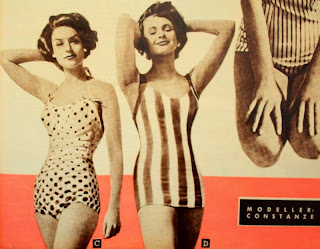 | Constance'nin sunmuş olduğu mayolardan C'de görülen : Beyaz zemin üzerine kırmızı puanlı kumaştan çok şık ve yapılması kolay bir mayo. Göğüs penslerle oturtulmuştur. Göğsün ortasından geçen bir kup mayoyu çok biçimli yapmaktadır. Karın kısmı aşağıya kadar yanlardan hafifçe büzülmüştür. D'de görülende ise : Bu sene çok moda olan lacivert-beyaz renklerden geniş yollu bir mayo görülmektedir. Askılar sırtta geniş biye şeklinde başlamaktadır ve yanlarda omuzlara çıktıktan sonra geriye doğru kıvrılmakta...1959 |