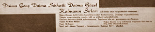 Sahaflarda aranmaya değer bir kitap... "Daima genç, daima sıhhatli, daima güzel kalmanın sırları" adlı kitabı okur ve içindekileri yaparsanız : İlaçsız (Kanser dahil) bütün hastalıklarınızdan kurtulursunuz. Gençleşir ve güzelleşirsiniz. Titreşim araştırıcılarıyla maziyi, hali ve istikbali keşfedebilirsiniz. Ömrünüz boyunca gözlük kullanmazsınız. Zayıfsanız kilo alır, şişmansanız zayıflarsınız. Yazan : Ali Rıza Akısan Fiyatı 10 liradır. Meşhur alimlerin ve tıp doktorlarının tavsiyelerini ihtiva eden bu kitap, bütün kitapçılarda bulunur. Tevzi yeri : Akısan Yayınevi - Nuruosmaniye Caddesi 57/1 - İstanbul (1959) |