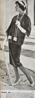 Gençlere Göre Takma truvakar kollu, acı yeşil yünlüden yapılmış bu kıyafette gömlek yakası şeklindeki yaka kumaşa yatık dikilmiştir. İki yan dikişten gelen martingal üç parmak genişliğindedir. Tayyörü gençlere yakıştırmak için ön tarafa beyaz parçalar ilave edilmiştir. Eldiven, ayakkabı, şemsiye ve şapkada keza beyazdır...Gattinoni 1959 |